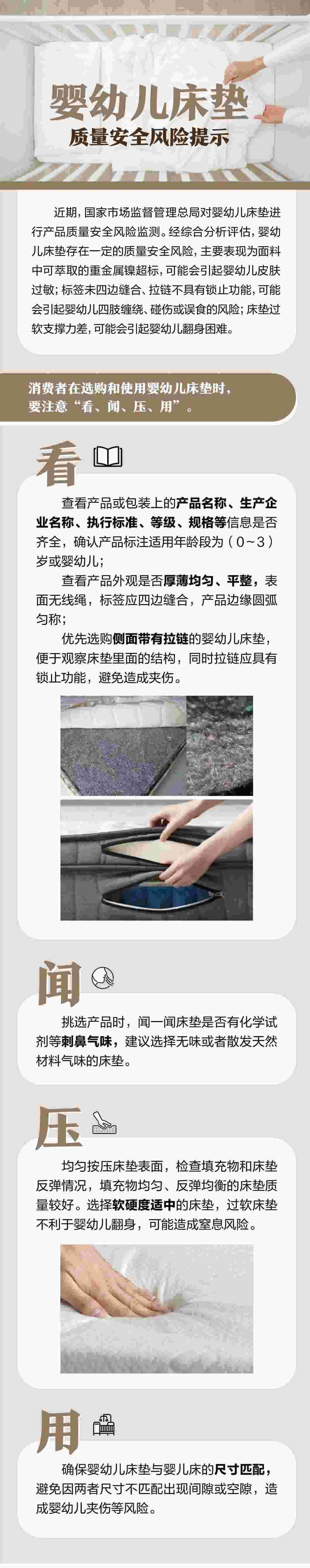 嬰幼兒床墊存在一定的質(zhì)量安全風(fēng)險(xiǎn),主要表現(xiàn)為面料中可萃取的重金屬鎳超標(biāo),可能會(huì)引起嬰幼兒皮膚過敏;標(biāo)簽未四邊縫合、拉鏈不具有鎖止功能,可能會(huì)引起嬰幼兒四肢纏繞、碰傷或誤食的風(fēng)險(xiǎn);床墊過軟支撐力差,可能會(huì)引起嬰幼兒翻身困難。