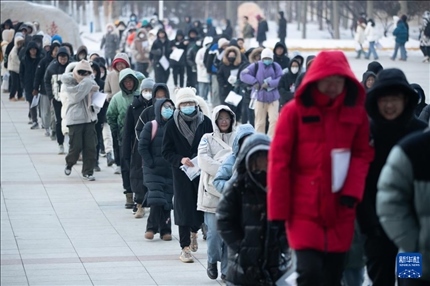 12月23日,在黑龍江省哈爾濱市,考生在哈爾濱理工大學(xué)考點(diǎn)排隊(duì)進(jìn)入考場(chǎng)。