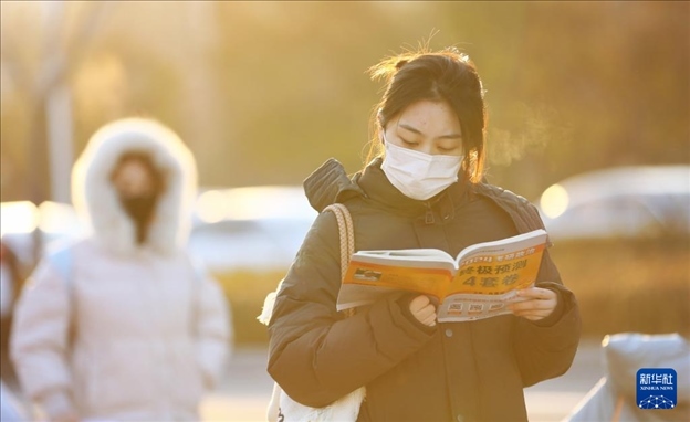 12月23日,在山東省煙臺(tái)市萊山一中考點(diǎn)外,考生抓緊時(shí)間復(fù)習(xí)。