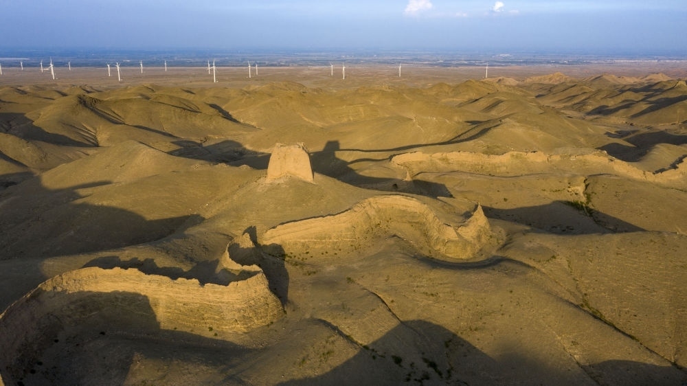 這是位于寧夏銀川市境內(nèi)的三關(guān)口土夯明長城(無人機(jī)照片,2021年8月13日攝)。