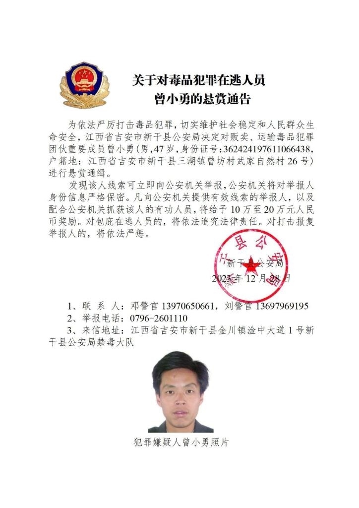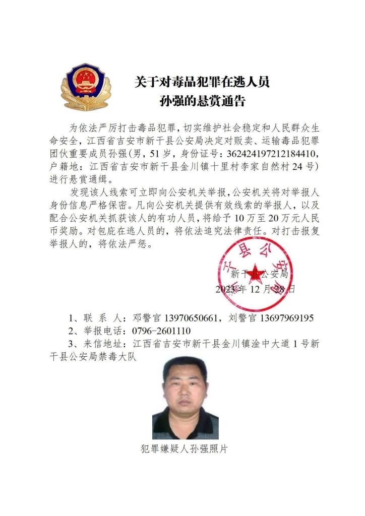 其中,湖南省郴州市公安局決定對張安龍、馬文祥、吳玉楊進(jìn)行公開懸賞通緝;湖南省株洲市公安局決定對楊金梅進(jìn)行公開懸賞通緝;江西省新干縣公安局決定對曾小勇、李國平、孫強(qiáng)進(jìn)行公開懸賞通緝;浙江省溫州市公安局決定對顏歡平進(jìn)行公開懸賞通緝;四川省遂寧市公安局決定對母朝東進(jìn)行公開懸賞通緝;貴州省黔東南州公安局決定對龍華進(jìn)行公開懸賞通緝。