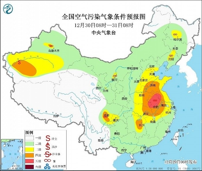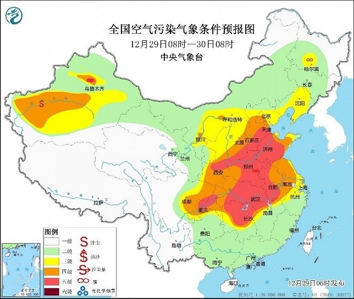 今天至30日白天,將是本次霧和霾天氣過程影響最重的時段,預(yù)計(jì)華北中南部、黃淮中西部、汾渭平原、江漢、四川盆地等地將有輕至中度霾,其中,天津、河北中南部、山東西部、河南北部等地有重度霾。29日夜間至30日的早晨至上午時段,華北中南部、黃淮、江淮等地的部分地區(qū)仍有大霧天氣,今天18時將繼續(xù)發(fā)布大霧預(yù)警。