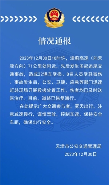 ·津薊高速發(fā)生多起追尾交通事故,警方通報(bào):致22輛車受損、8人輕微傷。