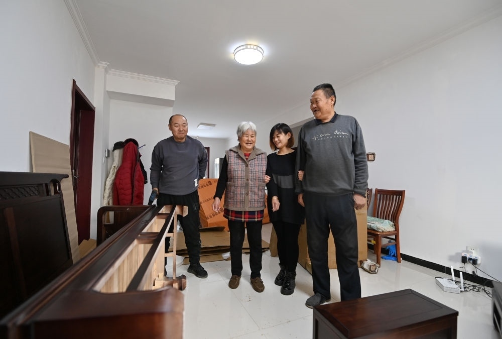 天津市西青區(qū)辛口鎮(zhèn)水高莊村村民王恩龍(右一)與家人搬入新家(12月12日攝)。新華社記者 李然 攝