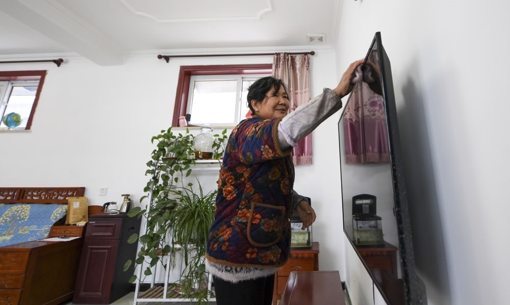 在北京市房山區(qū)佛子莊鄉(xiāng)陳家臺(tái)村,61歲的村民馬書(shū)金在修繕后的房子內(nèi)擦拭電視(12月12日攝)。新華社記者 鞠煥宗 攝