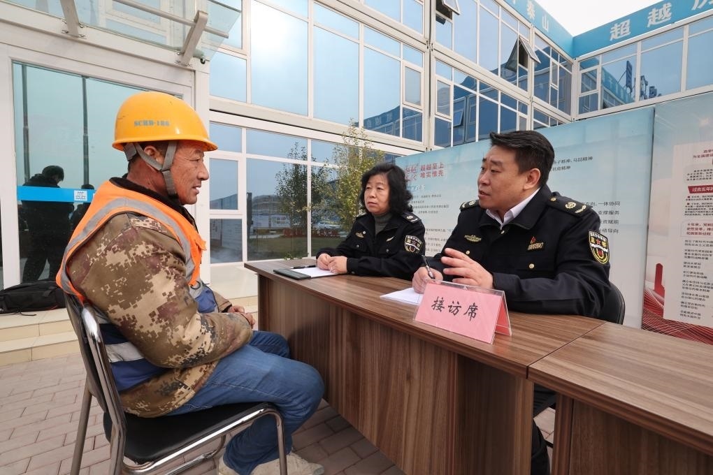 圖為北京市根治拖欠農(nóng)民工工資工作協(xié)調(diào)小組在新國展二期建設(shè)工地進(jìn)行現(xiàn)場(chǎng)接訪。(北京市人社局供圖)