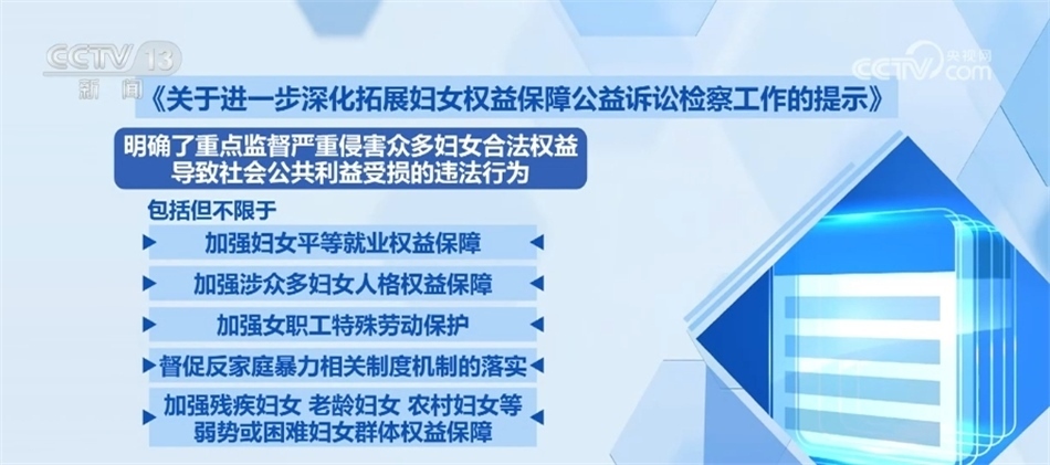最高檢相關(guān)部門負責人介紹,2023年1月1日,修訂后的《中華人民共和國婦女權(quán)益保障法》正式施行,明確授權(quán)檢察機關(guān)開展婦女權(quán)益保障領(lǐng)域公益訴訟。實踐中,侵害婦女權(quán)益的違法情形往往存在一定的隱蔽性、復雜性。《工作提示》要求,要善于從刑事案件中發(fā)現(xiàn)普遍性、源頭性問題,強化訴源治理;要針對具體情況和具體問題,研判是否存在違法性和公益損害;要注意結(jié)合侵害婦女權(quán)益的不同違法情形,精準確定監(jiān)督對象和監(jiān)督方式,充分實現(xiàn)公益保護目的。