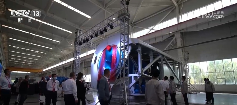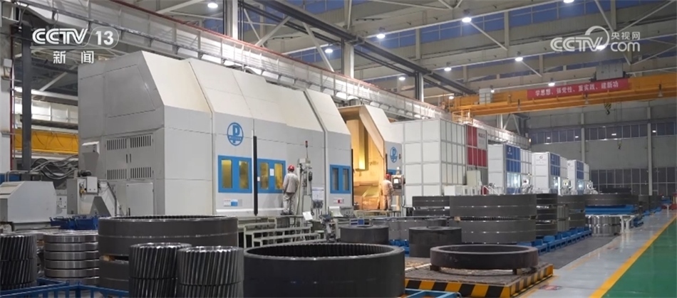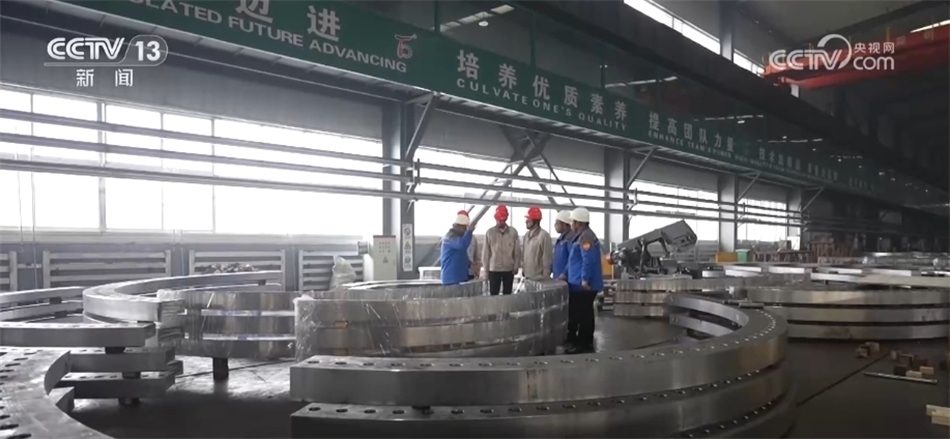 總臺央視記者 古峻嶺:這個(gè)大家伙叫輪轂,就是風(fēng)機(jī)葉輪中間這個(gè)位置,就是它把重達(dá)百噸的3支葉片牢牢固定在風(fēng)機(jī)之上。采用傳統(tǒng)人工的方式,需要2個(gè)人花上180分鐘才能安裝完,現(xiàn)在只需要80分鐘即可完成。傳統(tǒng)定點(diǎn)裝配模式一天只能裝配3—4臺主機(jī),而在現(xiàn)在的流水線上作業(yè),一天則可以裝配6—8臺主機(jī),效率翻倍,但是用工卻減少了一半。