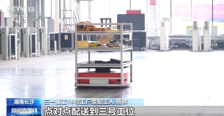 三一重工18號工廠裝配工人 陳輝:對于我們一個(gè)組裝工人來說,最麻煩的事莫過于找料和取料。我們過去都是自己找、自己拿,現(xiàn)在我們都是通過AGV小車點(diǎn)對點(diǎn)配送到三號工位。