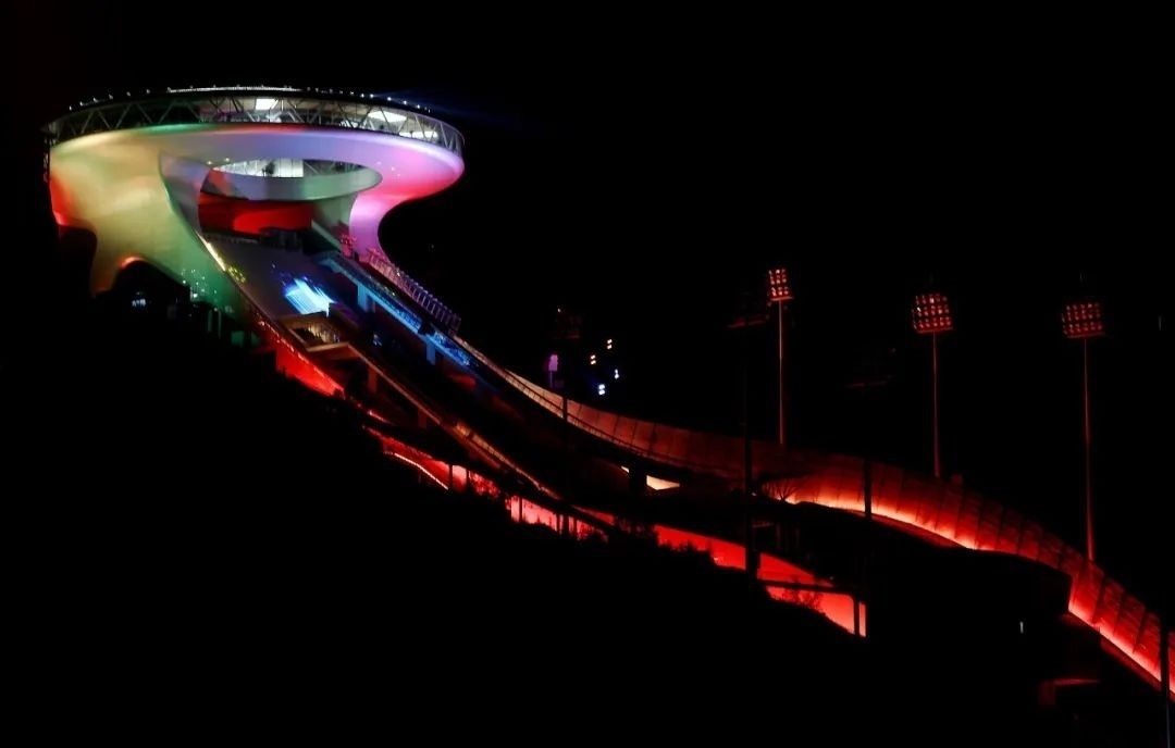 △國家跳臺(tái)滑雪中心外形如中國古代象征吉祥的如意,又名“雪如意”。