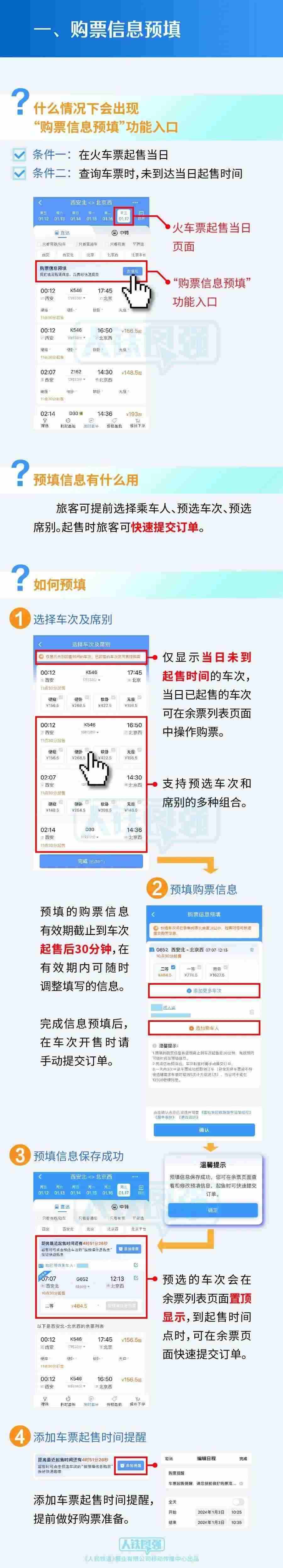 對(duì)于網(wǎng)購(gòu)火車票(12306手機(jī)App購(gòu)票)的旅客,鐵路部門提醒,首先,注意起售時(shí)間。不同火車站車票網(wǎng)上起售時(shí)間并不相同,旅客需根據(jù)自己購(gòu)票的車站查詢購(gòu)票具體時(shí)間,提前做好準(zhǔn)備,以免錯(cuò)過第一時(shí)間購(gòu)票。旅客可以打開12306官網(wǎng),點(diǎn)擊“信息查詢”欄目下的“起售時(shí)間”,再選擇起售日期和起售車站進(jìn)行查詢。其次,做好支付準(zhǔn)備。網(wǎng)購(gòu)車票時(shí)須在30分鐘內(nèi)完成支付,超時(shí)未支付的,車票將自動(dòng)取消。