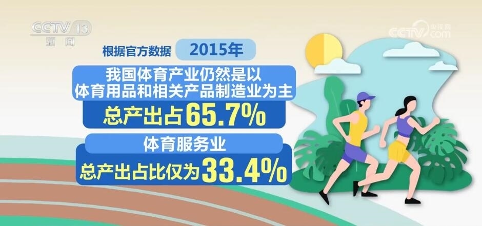 根據(jù)官方數(shù)據(jù),2015年,我國體育產(chǎn)業(yè)仍然是以體育用品和相關產(chǎn)品制造業(yè)為主,總產(chǎn)出占65.7%,體育服務業(yè)總產(chǎn)出占比僅為33.4%。不過,在增加值層面,體育服務業(yè)占比達到了49.2%,呈現(xiàn)出巨大的潛力和快速增長的態(tài)勢。