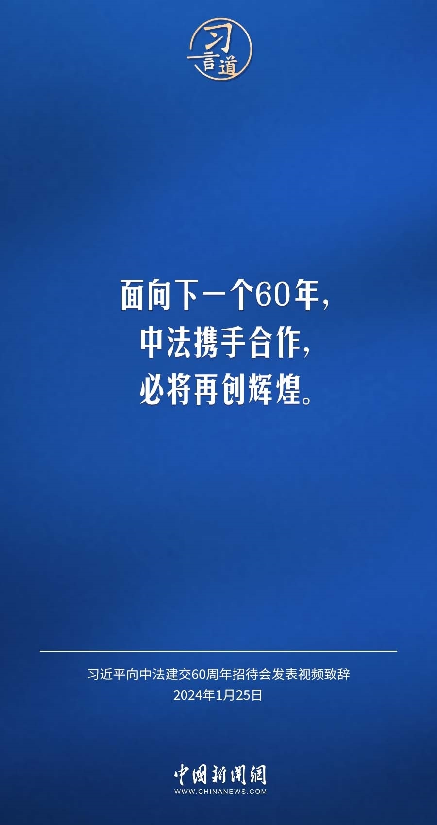 1月25日,中法建交60周年招待會(huì)在國(guó)家大劇院舉行,國(guó)家主席習(xí)近平發(fā)表視頻致辭。習(xí)近平指出——