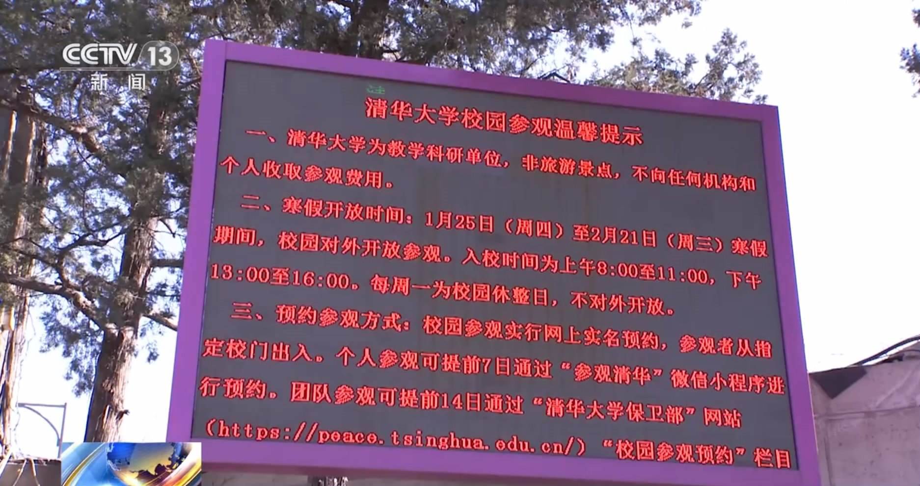 清華大學(xué)保衛(wèi)部 張運騰:因為寒假的時候,學(xué)校仍然有一些教學(xué)科研的任務(wù)還在進(jìn)行,到一些教室或者實驗室周邊,希望能夠輕音輕語,文明參觀。我們也在這里也特別倡導(dǎo)大家進(jìn)入校園以后能夠遵守學(xué)校的管理的一些規(guī)定。