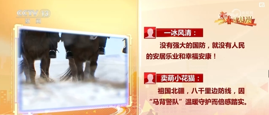 《新春走基層·馬背警隊:風(fēng)雪中的溫暖守護》播出后,有網(wǎng)友說:“沒有強大的國防,就沒有人民的安居樂業(yè)和幸福安康!”。也有網(wǎng)友說:“祖國北疆,八千里邊防線,因“馬背警隊”溫暖守護而倍感踏實?!?br>