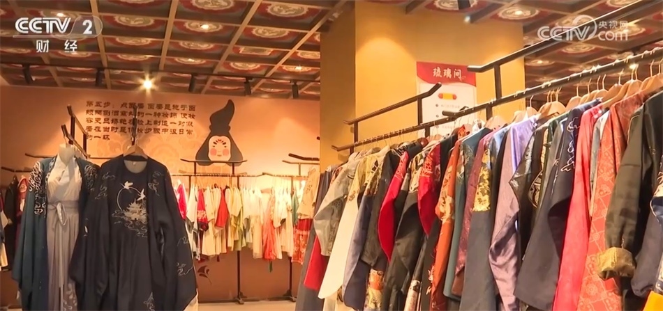 總臺記者 秦祎:我旁邊的這件就是店內(nèi)最受歡迎的唐裝之一——花想容,這件衣服里面是一件唐裝的基礎(chǔ)款造型齊胸襦裙,披上外披則是貴妃造型,如果擔(dān)心天氣冷可以像我一樣加上斗篷。