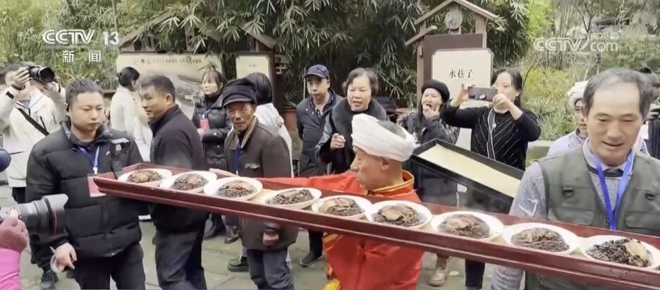 在熱鬧的現(xiàn)場(chǎng),最引人注目的就是“打盆”絕技,這也是川渝地區(qū)獨(dú)有的民俗上菜表演。四層高的蒸籠冒著熱氣,民間藝人將蒸籠里的菜肴放在一個(gè)長(zhǎng)2米、寬20厘米的木托盤里,將其頂在頭上,不用手扶,傳送到長(zhǎng)桌宴上。