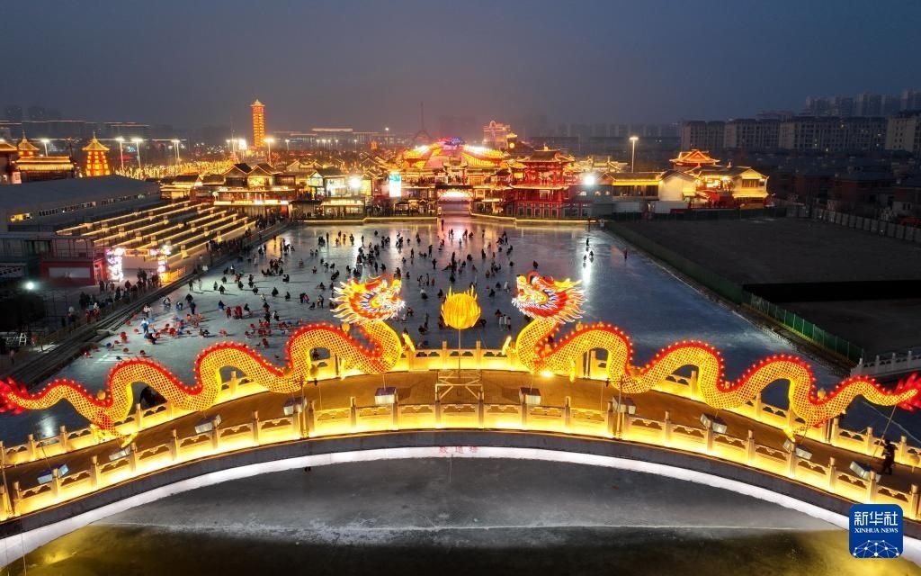游客在河北省唐山市豐南區(qū)河頭老街滑冰場(chǎng)滑冰(無人機(jī)照片)。