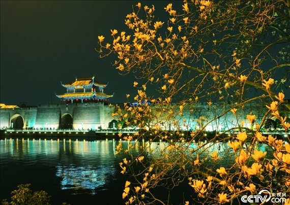 蘇州護(hù)城河畔,一株株含苞欲放的玉蘭花在燈光映照下璀璨奪目。