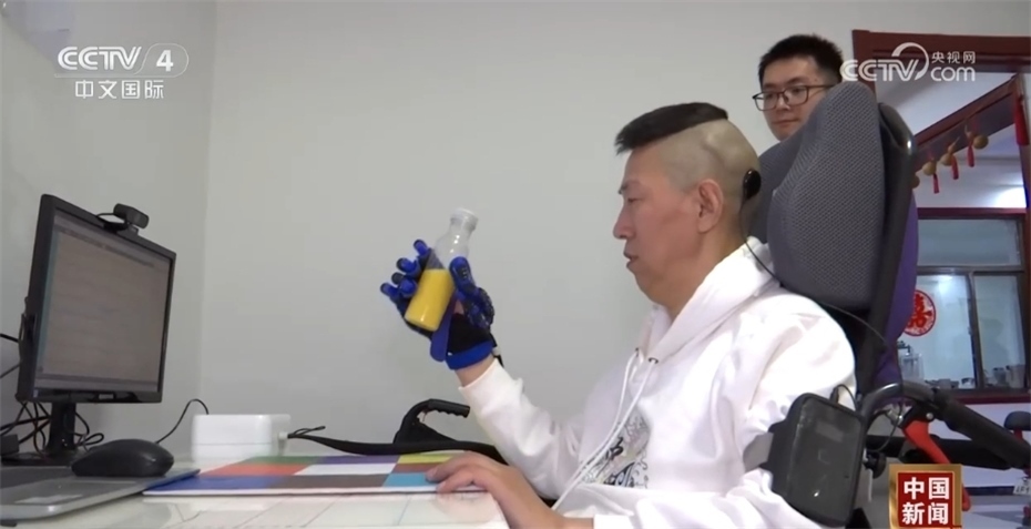 另一位患者楊先生四肢癱瘓長達14年,于去年10月24日接受了植入手術(shù),這也是中國首例無線微創(chuàng)腦機植入手術(shù)。在楊先生家中,記者記錄了他用意念操控外骨骼系統(tǒng)實現(xiàn)抓握和喝水的過程。他的妻子確認電腦和外骨骼系統(tǒng)都開機之后,就把無線接口貼在楊先生的頭部。隨著腦電波不斷被采集和解碼,楊先生驅(qū)動啟動手套外骨骼握住了水瓶,并將瓶子慢慢放在嘴邊。