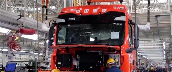 在山東濟(jì)南一家重卡生產(chǎn)企業(yè)的總裝車間里,貨運(yùn)機(jī)器人將重卡的車架依次傳送到各工作站,工人熟練地將發(fā)動(dòng)機(jī)、散熱器、輪胎等零件加裝到車架上。工作人員介紹,一輛重卡從接到訂單開始排產(chǎn)到交付客戶僅需五六天。