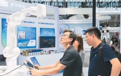 2023年6月16日,參展商在黑龍江省哈爾濱市舉辦的第三十二屆哈爾濱國(guó)際經(jīng)濟(jì)貿(mào)易洽談會(huì)現(xiàn)場(chǎng)展示醫(yī)療機(jī)器人的用法。