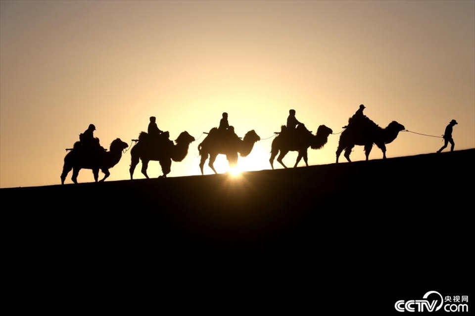 27日,甘肅敦煌,鳴沙山月牙泉景區(qū)晨光如畫,游客觀賞大漠日出,乘騎駱駝體驗(yàn)絲路風(fēng)情。