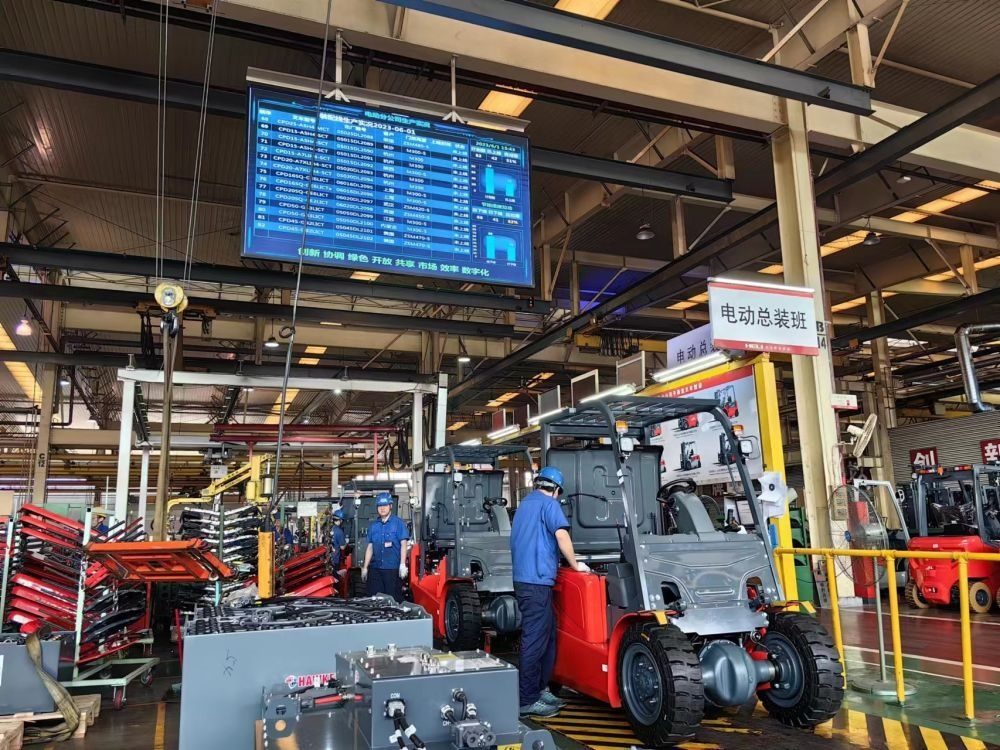 在安徽合力股份有限公司的生產(chǎn)車(chē)間,工人們?cè)谏a(chǎn)銷(xiāo)往RCEP成員國(guó)的叉車(chē)(2023年6月1日攝)。新華社記者 汪海月 攝