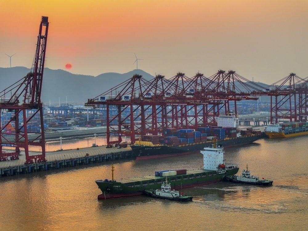 浙江寧波舟山港金塘港區(qū)碼頭作業(yè)繁忙(2024年2月11日攝,無(wú)人機(jī)照片)。新華社發(fā)(姚峰 攝)