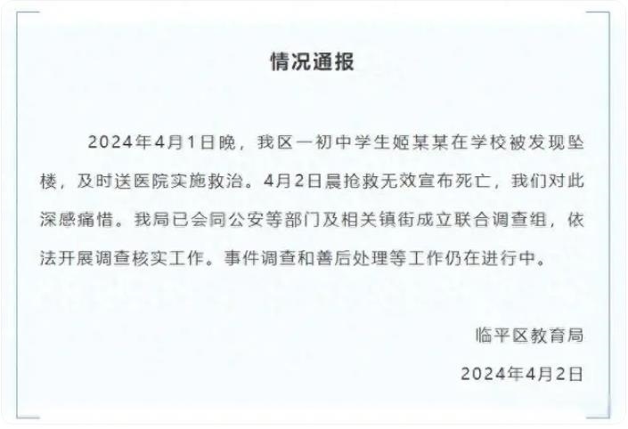 ·杭州臨平教育局通報(bào)“一初中學(xué)生在學(xué)校墜樓死亡”:成立聯(lián)合調(diào)查組。