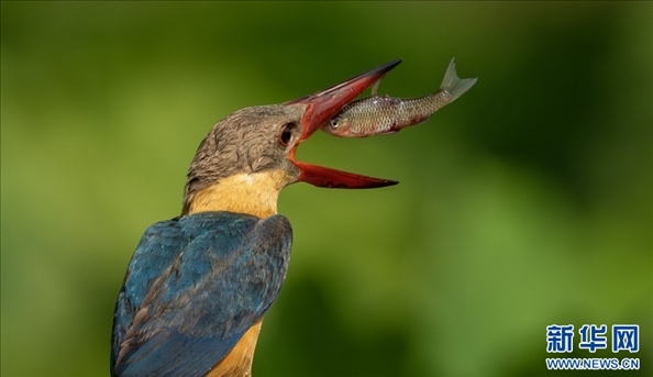 鸛嘴翡翠進食瞬間(3月30日攝)。新華網發(fā)(朱邊勇 攝)