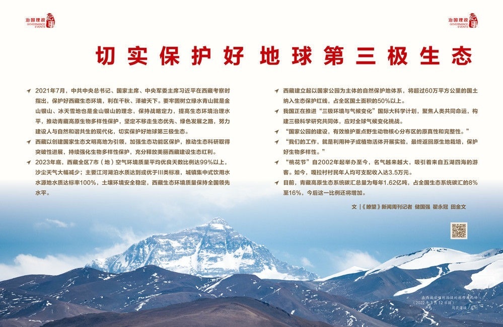 ◇2021年7月,中共中央總書記、國(guó)家主席、中央軍委主席習(xí)近平在西藏考察時(shí)指出,保護(hù)好西藏生態(tài)環(huán)境,利在千秋、澤被天下。要牢固樹立綠水青山就是金山銀山、冰天雪地也是金山銀山的理念,保持戰(zhàn)略定力,提高生態(tài)環(huán)境治理水平,推動(dòng)青藏高原生物多樣性保護(hù),堅(jiān)定不移走生態(tài)優(yōu)先、綠色發(fā)展之路,努力建設(shè)人與自然和諧共生的現(xiàn)代化,切實(shí)保護(hù)好地球第三極生態(tài)。