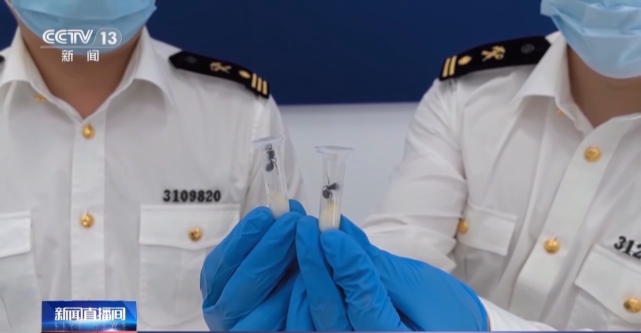 昆明海關(guān)所屬河口海關(guān)行郵一科關(guān)員 楊璨隆:這些螞蟻體型較大,色澤和常規(guī)螞蟻有所不同,而且很有活力,每根管子內(nèi)還裝著用來保濕的棉花,是異寵的嫌疑很大。