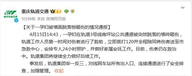 ·重慶軌交回應“孕婦被墻面脫落物砸傷”:傷者仍在救治中。