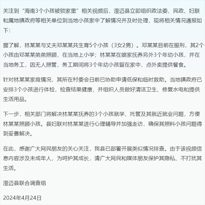 ·官方通報(bào)“海南3個(gè)小孩被鎖家里”:村委會(huì)已協(xié)助申請(qǐng)低保和臨時(shí)救助。