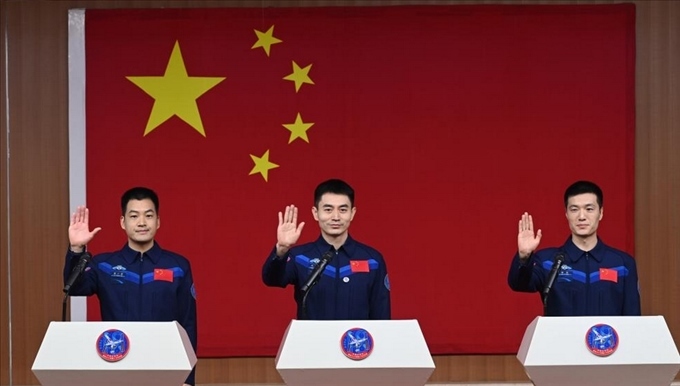 神舟十八號(hào)瞄準(zhǔn)4月25日20時(shí)59分發(fā)射,航天員葉光富(中)、李聰(右)、李廣蘇在酒泉衛(wèi)星發(fā)射中心問天閣與媒體記者集體見面。
