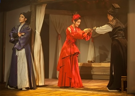 新國(guó)風(fēng)環(huán)境式越劇《新龍門客棧》起初在短視頻平臺(tái)走紅,熱度從線上傳導(dǎo)至線下,許多從未接觸過越劇的觀眾走入劇場(chǎng)。環(huán)境式劇場(chǎng)不同于傳統(tǒng)劇場(chǎng)的鏡框式舞臺(tái),舞臺(tái)不只是面前的一塊區(qū)域,而是實(shí)現(xiàn)了觀眾“身在其中”,濃厚的“氛圍感”撲面而來。