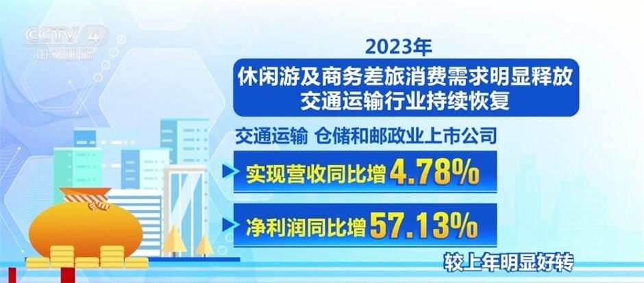 2023年,休閑游及商務(wù)差旅消費(fèi)需求明顯釋放,交通運(yùn)輸行業(yè)持續(xù)恢復(fù),交通運(yùn)輸、倉(cāng)儲(chǔ)和郵政業(yè)上市公司實(shí)現(xiàn)營(yíng)收、凈利潤(rùn)同比增4.78%、57.13%,較上年明顯好轉(zhuǎn)。