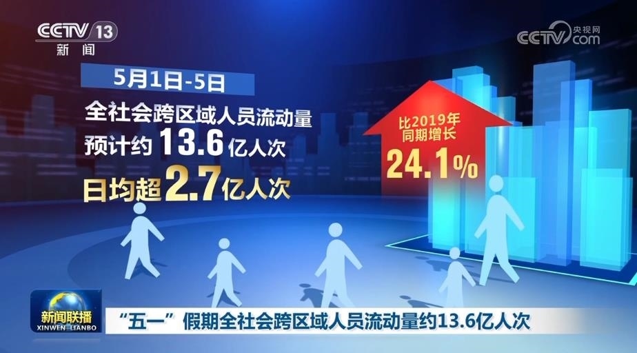 初步統(tǒng)計顯示,5月1日—5日,全社會跨區(qū)域人員流動量預(yù)計約13.6億人次,日均超2.7億人次,比2019年同期增長24.1%。