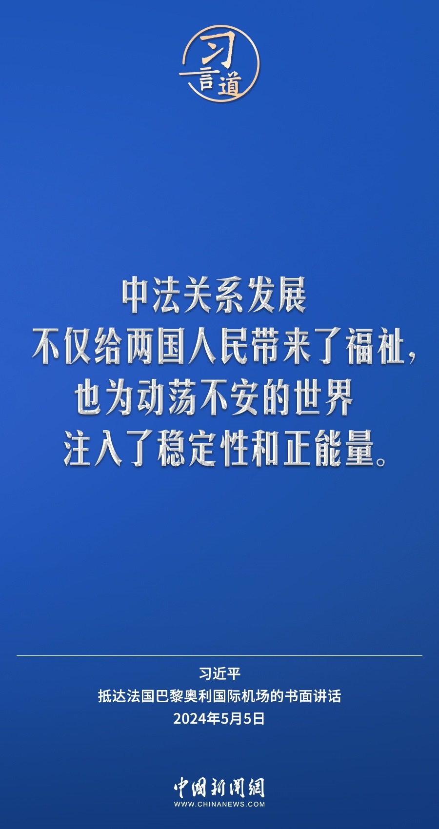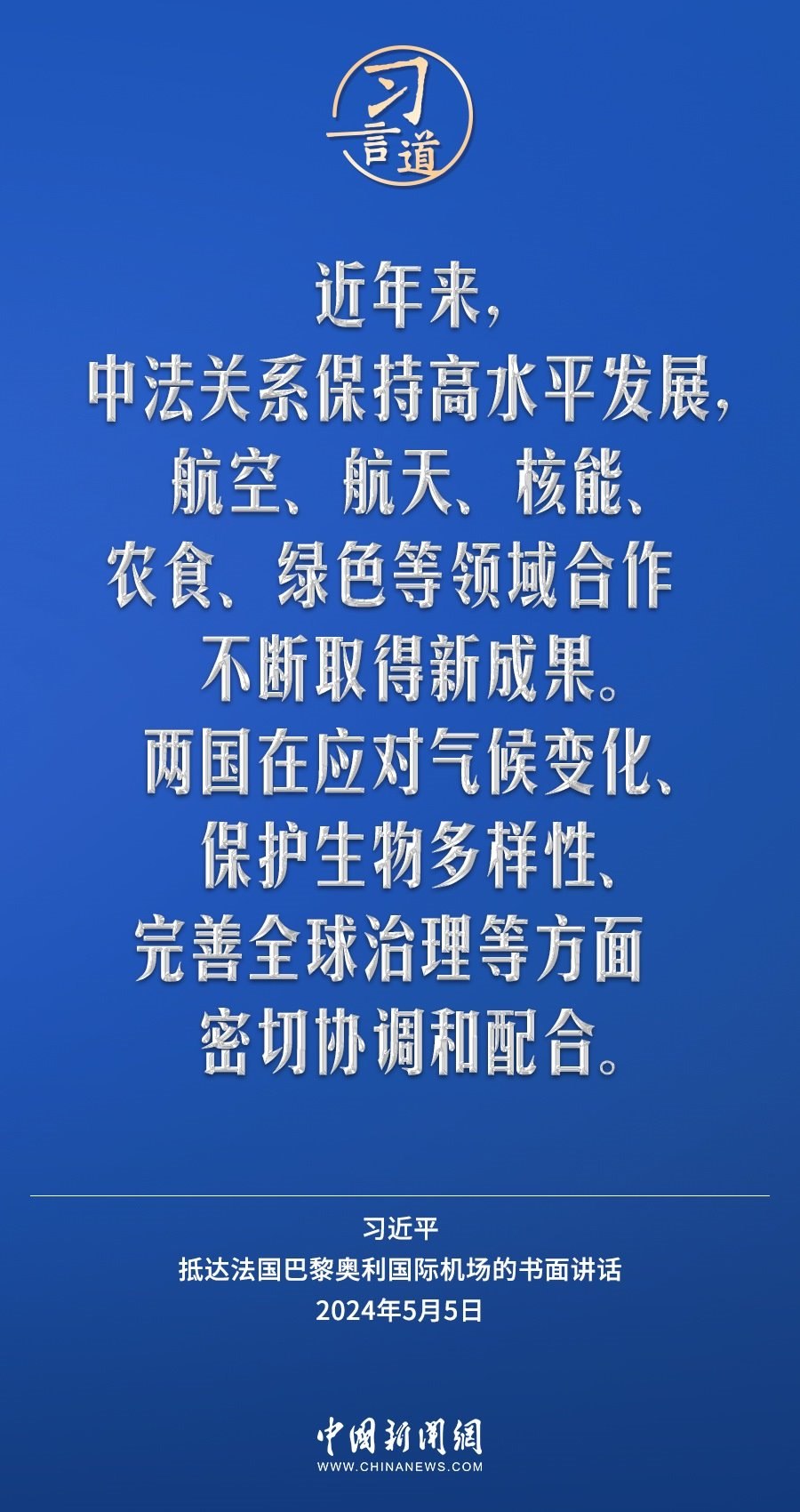 當(dāng)?shù)貢r(shí)間5月5日下午,國(guó)家主席習(xí)近平抵達(dá)巴黎,開(kāi)始對(duì)法國(guó)進(jìn)行國(guó)事訪問(wèn)。在抵達(dá)法國(guó)巴黎奧利國(guó)際機(jī)場(chǎng)的書(shū)面講話(huà)中,習(xí)近平指出——