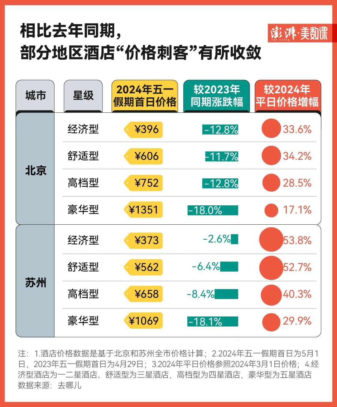 從去哪兒平臺(tái)提供的數(shù)據(jù)來(lái)看,在今年“五一”假期的首日,北京和蘇州的經(jīng)濟(jì)型酒店相比平日價(jià)格分別漲了三成和五成左右,難怪在社交媒體上總能看到“五一不是不出門,是酒店住不起”的吐槽聲。