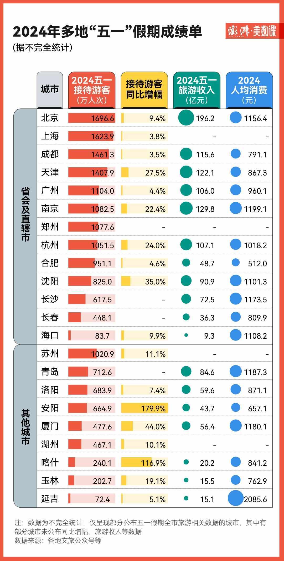 不過(guò),像是北京、上海、成都、天津等城市依然是熱門的旅游目的地。在目前已公布“五一”假期數(shù)據(jù)的省會(huì)及直轄市中,北京、上海就以1696.6萬(wàn)、1623.9萬(wàn)接待游客人次名列前茅。
