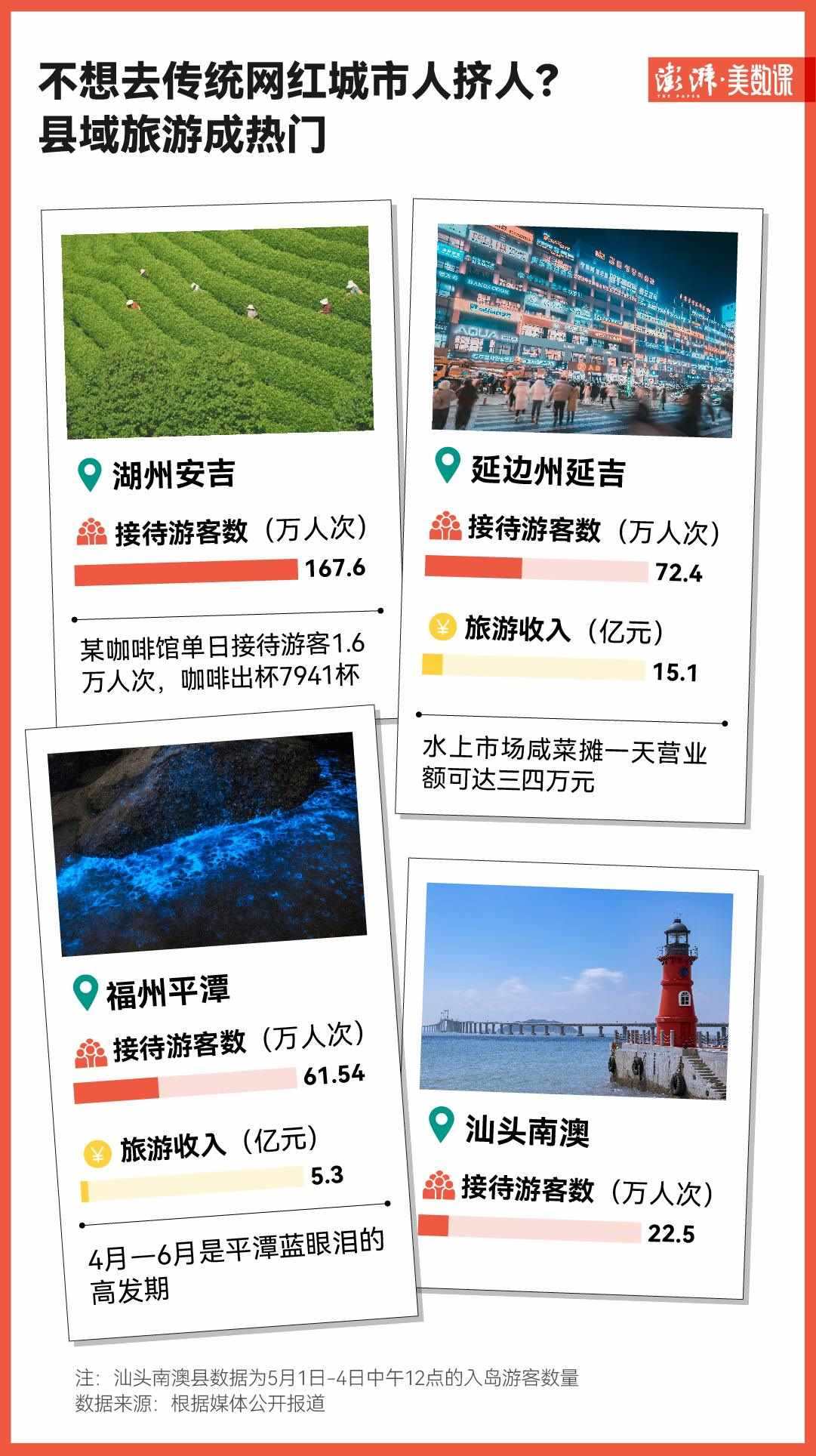 不僅如此,旅游下沉化的趨勢(shì)已經(jīng)來(lái)到了縣級(jí)市。湖州安吉在這個(gè)“五一”假期就收獲了167.6萬(wàn)人次的游客數(shù)量。據(jù)“安吉旅游”公眾號(hào),當(dāng)?shù)啬晨Х瑞^單日接待游客1.6萬(wàn)人次,咖啡出杯7941杯。