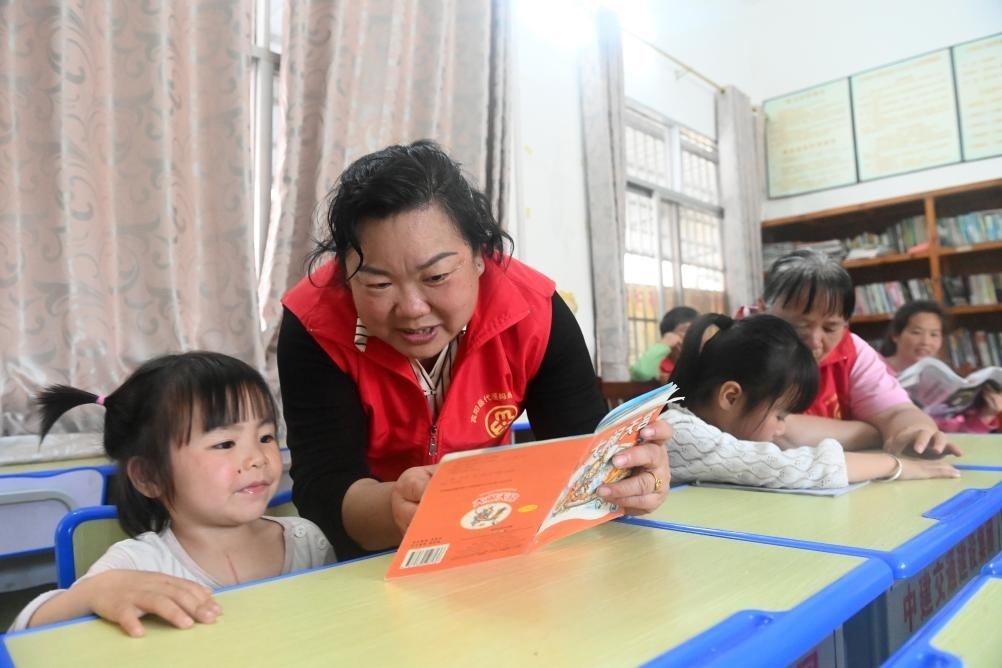 ?↑在廣西賓陽(yáng)縣中華鎮(zhèn)的一個(gè)“留守兒童之家”,張清秀(左二)陪小朋友閱讀(2024年3月5日攝)。