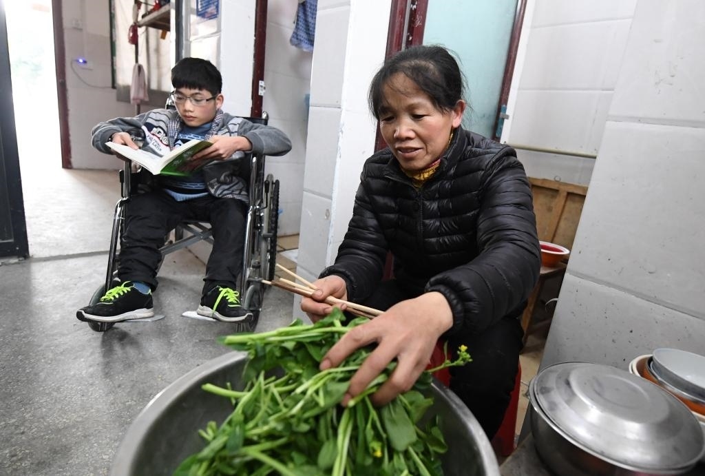 母子倆日常生活開支幾乎都?jí)涸邳S乜鮮一個(gè)人身上。她家里種有三畝田,只有節(jié)假日才能回去打理。平時(shí),她在照顧兒子之余,在學(xué)校撿拾廢舊物品賣錢補(bǔ)貼生活費(fèi)。“再苦再累也要咬牙堅(jiān)持下去?!秉S乜鮮說。