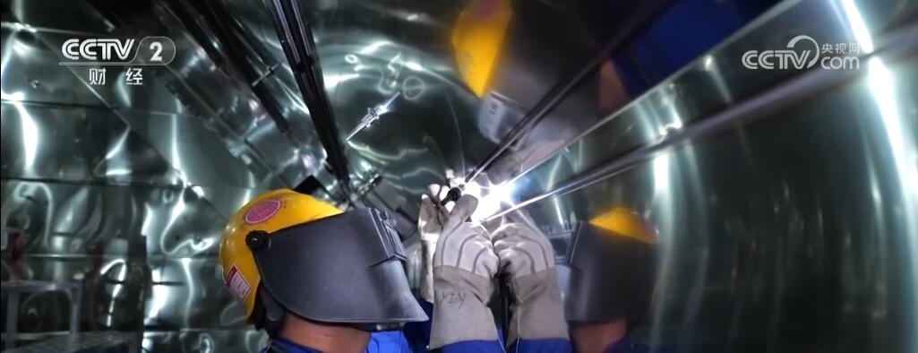 上海市長興島造船基地,記者身后的巨輪是我國新一代天然氣運(yùn)輸船“綠能瀛”,它總長299米,寬度是46.4米,這一艘船的用鋼量就達(dá)到了25000噸,其甲板面積相當(dāng)于3個(gè)標(biāo)準(zhǔn)足球場,可裝載17.4萬立方米液化天然氣,能夠滿足700萬個(gè)家庭一個(gè)月的用氣需求。