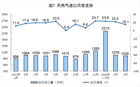 1—4月份,規(guī)上工業(yè)天然氣產(chǎn)量830億立方米,同比增長5.0%。進(jìn)口天然氣4300萬噸,同比增長20.7%。