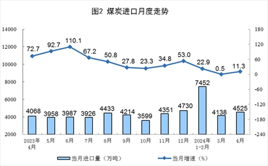 原煤生產(chǎn)降幅收窄,進(jìn)口明顯回升。4月份,規(guī)上工業(yè)原煤產(chǎn)量3.7億噸,同比下降2.9%,降幅比3月份收窄1.3個百分點;日均產(chǎn)量1239萬噸。進(jìn)口煤炭4525萬噸,同比增長11.3%。