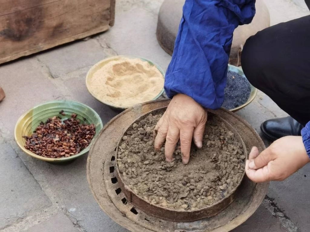沖好針孔,便在磨石上反復(fù)銼尖。隨后倒入熱鍋里翻炒,再舀入一瓢水,針的剛性和硬度由此增加。接下來便輪到三大碗“大陽秘方”登場:白崖土粉末、松木炭和發(fā)酵后的豆豉,用于蒸針?!八赡咎靠梢栽黾愉撫樀暮剂?,提升硬度;豆豉增加亮度;白崖土粉末作為分散劑讓針受熱均勻。這樣處理后可以保證針質(zhì)更堅硬又有光澤?!?/p>