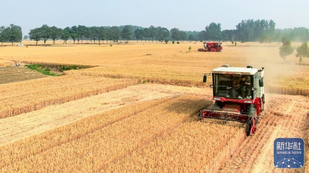 5月25日,在河南省駐馬店市汝南縣三橋鎮(zhèn)殷店村,收割機、秸稈摟草機在麥地里穿梭作業(yè)。新華社發(fā)(張萌攝)